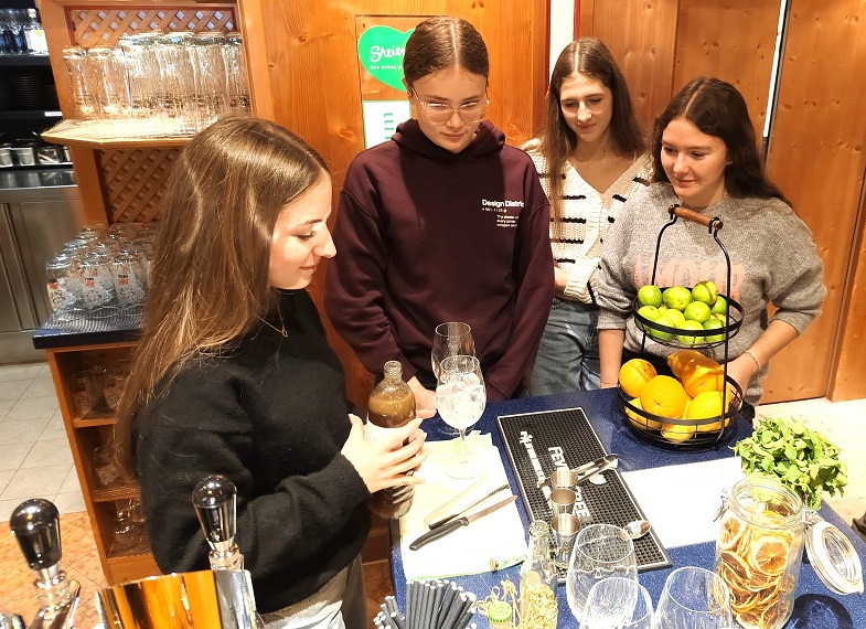 Immer wieder gerne kommt die HLW Bad Aussee mit ihren SchülerInnen der ersten Klasse zu einem Praxistag nach Grundlsee zum MONDI Holiday. Zuerst erläuterte Direktor Franz Kromoser persönlich in einer ausführlichen und sehr netten Betriebsbesichtigung die Funktionen von Rezeption, Housekeeping, Technik, Eventmanagement, Küche und Service in einem so großen Tourismusbetrieb. „Da wird schon das eine oder andere attraktive Berufsbild für die Jugendlichen entstanden sein,“ sagt der begleitende Kochlehrer Dominik Pirker. In einem Barworkshop mit einer Verkostung der selbst gemixten alkoholfreien Cocktails konnte man das eigene Geschick testen. Ob das abschließende gemeinsame köstliche Mittagessen als Anreiz für künftiges Personal gedacht war, ist nicht überliefert.